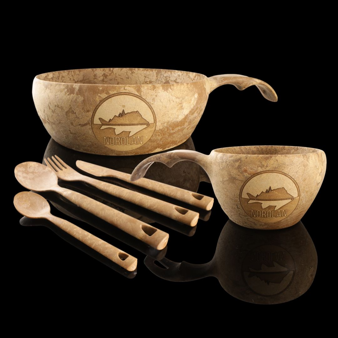 Le Kit Dîner Pleine Nature de Norolan inclut une tasse kuksa traditionnelle, un plat pleine nature durable ainsi qu'un ensemble de couverts (une fourchette, un couteau, une cuillère & une cuillère à café), tous désignés et fait-main en Finlande à partir d'une fibre composite naturel et éco-responsable qui combine la sensation du bois avec l'aspect pratique des matériaux modernes.